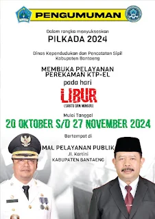 Mulai tanggal 16 Oktober sampai tanggal 20 Oktober 2024 kami tetap melayani Siswa -Siswi yang serta sekolah- Sekolah, madrasa dan Alia, sebab bagi anak sekolah yang berusia mulai 17 tahun itu sudah bisa dapatkan KTP dan akan selesai dengan cepat.Di ungkapkan pula bahwa kami juga masih membuka perekaman bagi Masyarakat Mulai tanggal 20 Oktober sampai tanggal 27 Nopember, di hari penusukan nanti
